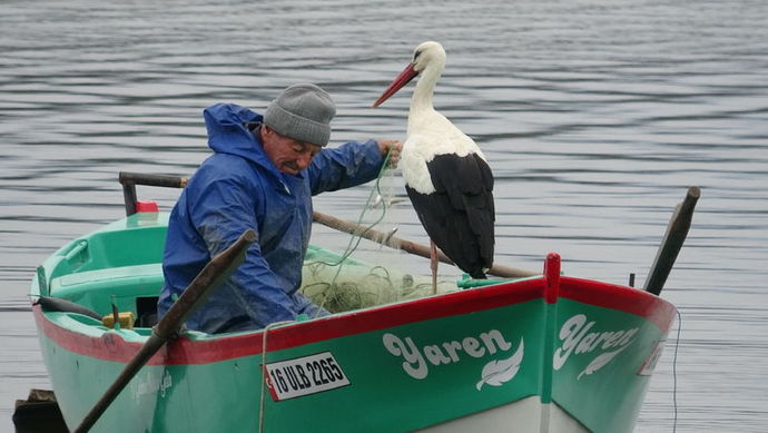 Yaren leylek, her yıl olduğu gibi göle açılan Yılmaz’ın kayığına konarak tuttuğu balıklarla beslendi.