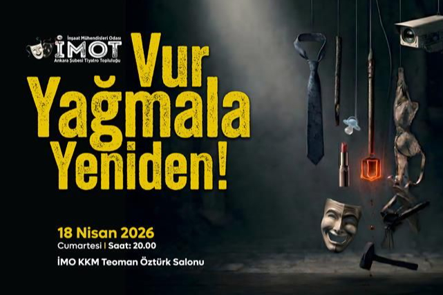 Ankara— İnşaat Mühendisleri Odası Ankara Şubesi Tiyatro Topluluğu (İMOT), 18 Nisan Cumartesi günü saat 20.00’de İMO KKM Salonu’nda 15. yeni oyunu “Vur/Yağmala/Yeniden” ile seyirci karşısına çıkacağını duyurdu.
